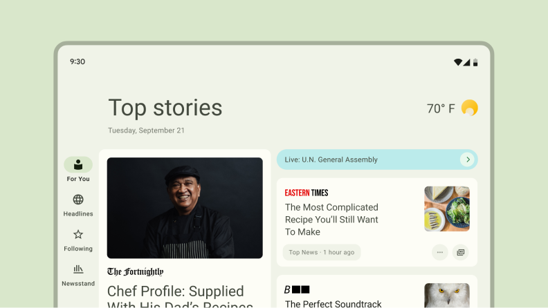 Tata letak kanonis memastikan pengalaman pengguna yang optimal untuk semua faktor bentuk layar besar—tablet, perangkat foldable, dan perangkat ChromeOS—serta mendukung semua ukuran ponsel. Komponen panel samping dan panel samping navigasi menyediakan navigasi yang canggih untuk kemudahan dan kontrol UI.