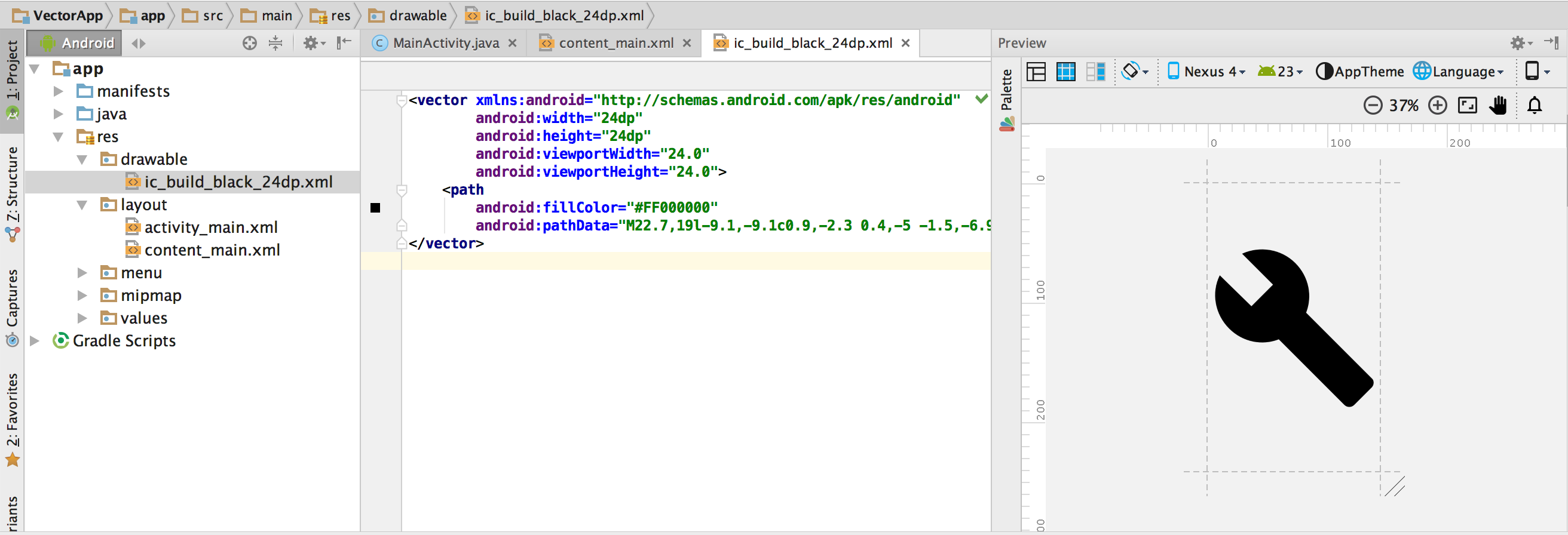 Vector Asset Studio یک فایل XML اضافه می کند که وکتور قابل ترسیم را به پروژه در پوشه app/src/main/res/drawable/ تعریف می کند. از نمای اندروید پنجره Project می توانید فایل XML وکتور تولید شده را در پوشه قابل ترسیم مشاهده کنید.