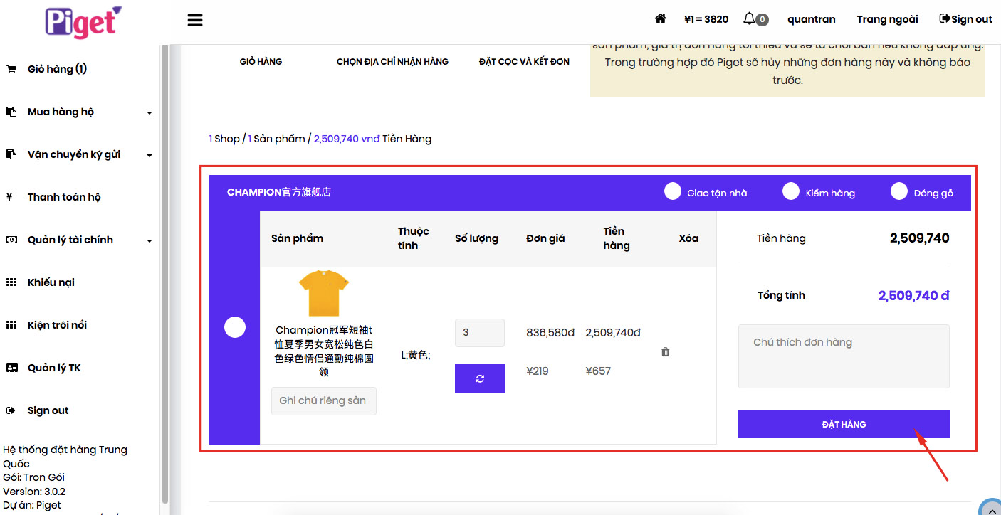 Sau đó nhấn vào nút ĐẶT HÀNG ở thanh công cụ bên dưới. Ngoài ra nếu bạn cần ghi chú gì cho sản phẩm có thể note vào để LCPAY đặt hàng chính xác hơn.
